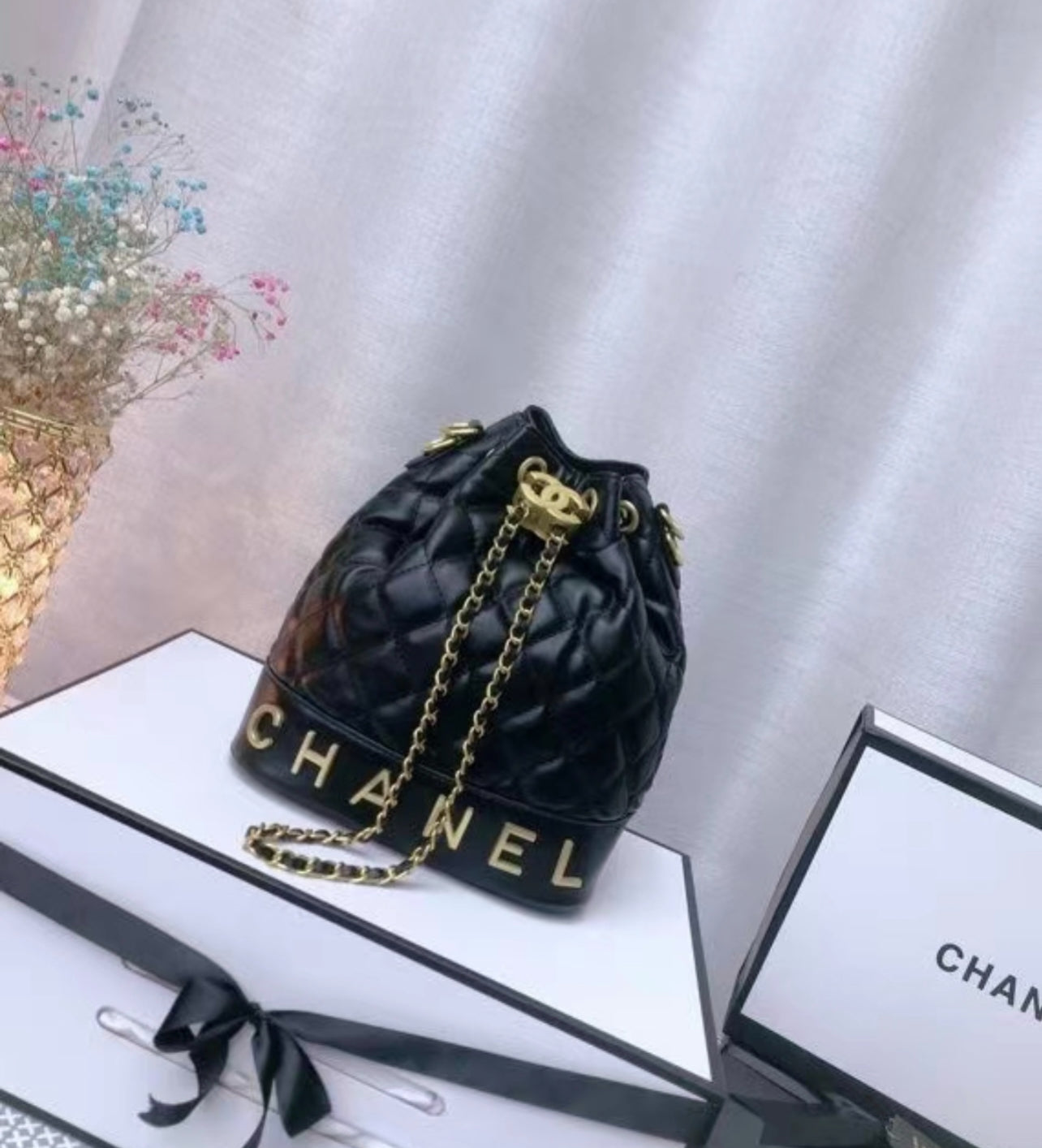 Medium Size Black & Gold C Drawstring Bag